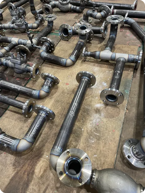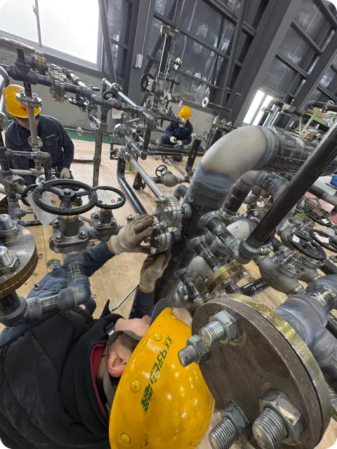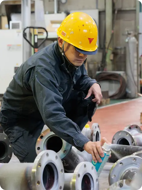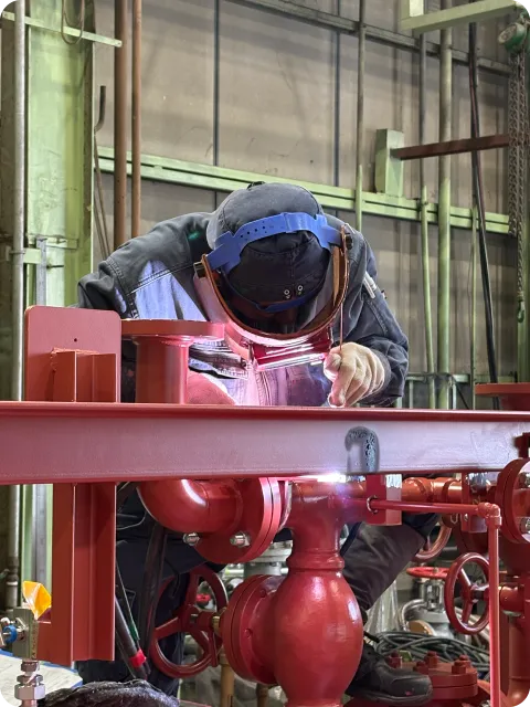お客様のお困り事、ご要望をお聞きし、打合せから、材料部品手配、曲げ・製缶溶接・配管加工溶接・機械加工の各工程を社内で行い、部品を製造。さらに組立、電気配線、性能試験、検査成績書作成、現地お届けまで責任を持って一貫して行います。